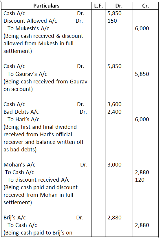 (i) Received Rs.5,850 from Mukesh in settlement of his account for Rs.6,000.