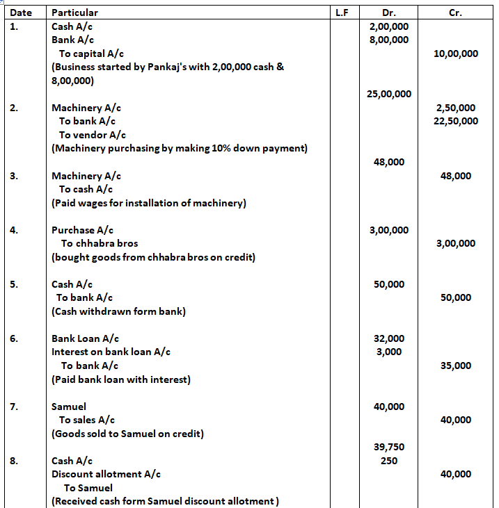 - Pankaj started business with cash 2,00,000 and Bank 8,00,000.