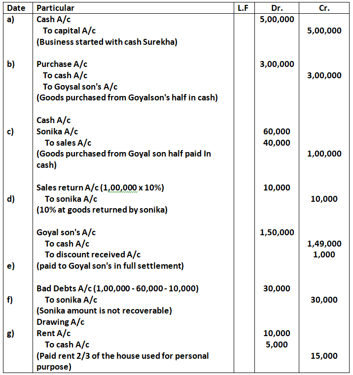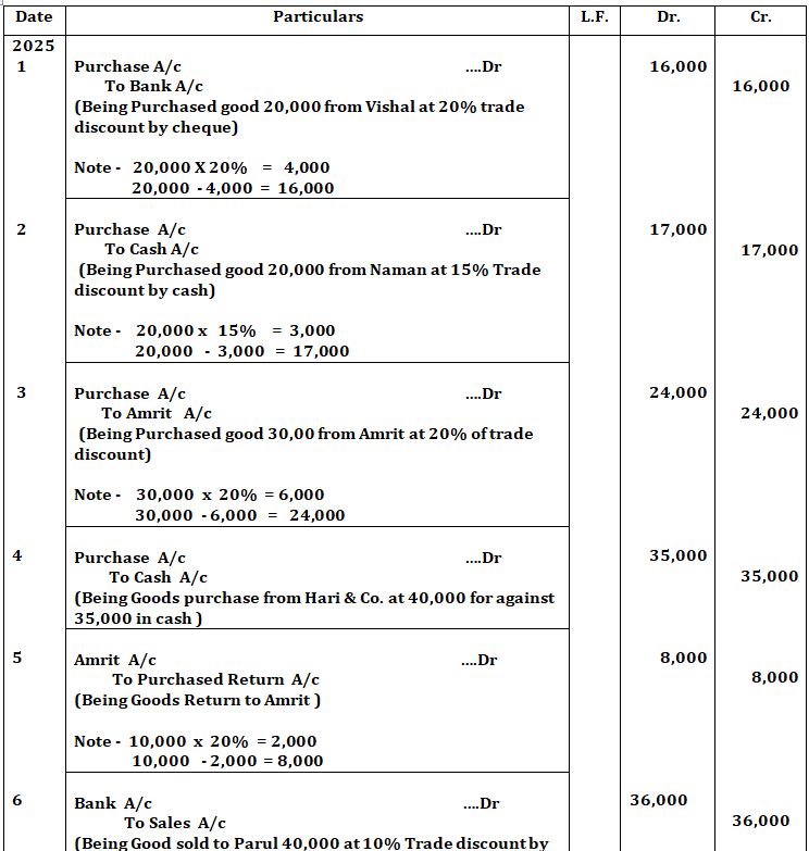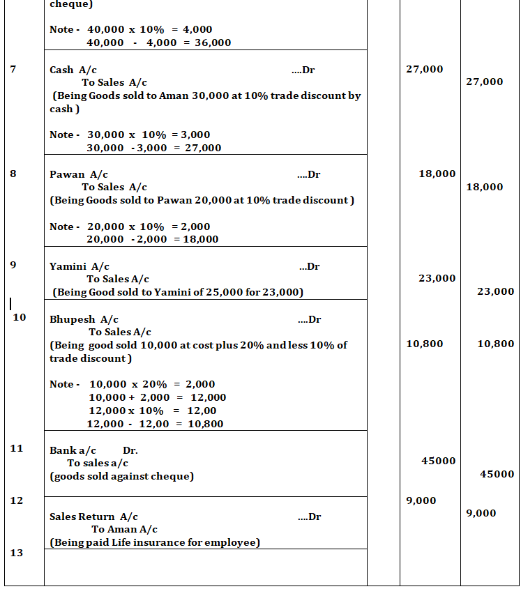 - Sold goods to Parul of list price of 40,000 at 10% trade discount against cheque payment