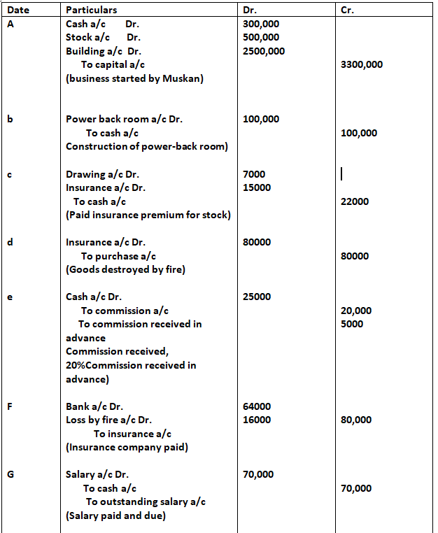 - Muskaan started business with cash 3,00,000, stock 5,00,000 and building 25,00,000.