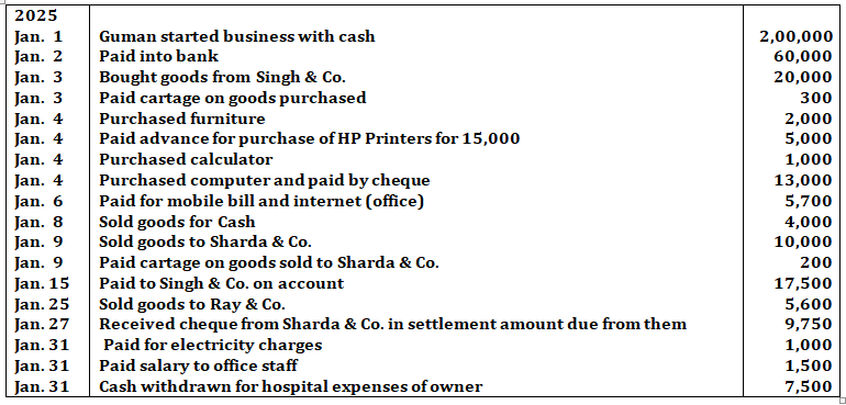 - Sold to Gupta Shawls, 100 shawls @ 200 per shawl on 4th January, 2025. Trade discount 25% and cash discount 5% if full payment is made within 14 days. Gupta shawls sent 50% of the payment on 14th January, 2025 and balance payment on 10th February, 2025.