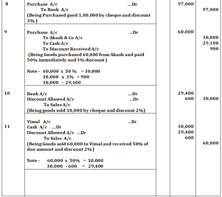 - Purchased goods costing 1,00,000 against cheque and availed discount of 3%